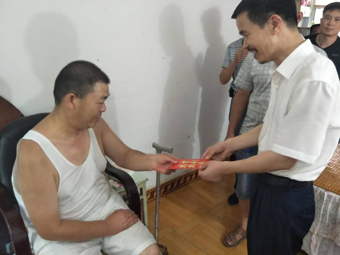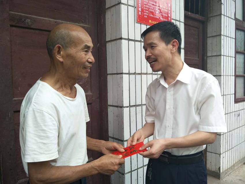 当天下午,慰问组一行在栗山社区孙书记等的陪同下挨家挨户地走访了孙强生、孙志祥、孙祥明、罗瑞林等同志。退休老党员孙强生是一名村干部,今年65岁了,唐书记将慰问金送到了他的手中,并感谢他为党的事业、为村部发展作出的贡献。