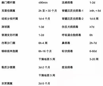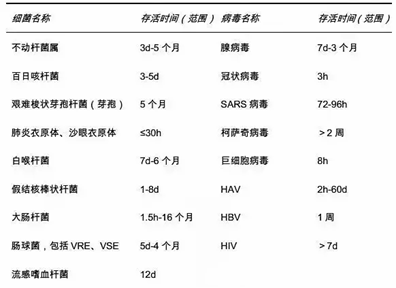 临床相关细菌、病毒在干燥无生命物体表面的存活时间表