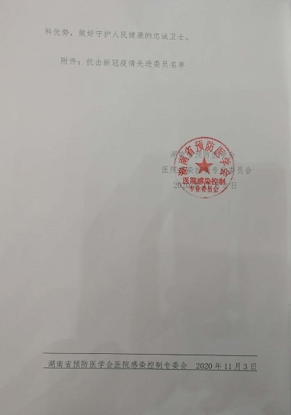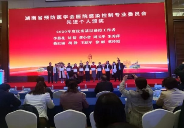 11月5日,从二0二0年度中华预防医学会医院感染控制专业委员会曁湖南省预防医学会医院感染控制专业委员会、微生态学专业委员会联合学术年会及评优表彰大会上获悉,我院感控科主任龚小省荣获湖南省2020年度“抗击新冠疫情先进委员--优秀基层感控工作者”荣誉称号。