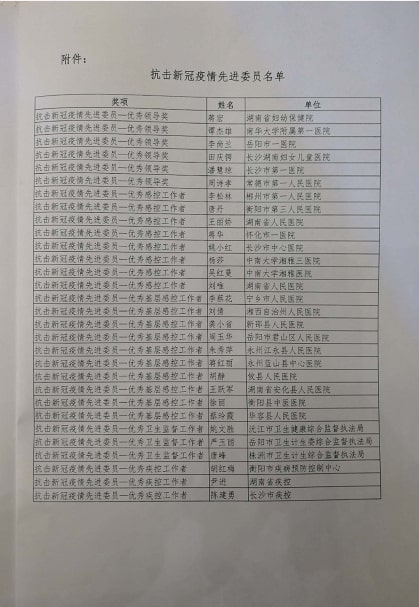 据悉,本次联合学术年会以“人人知晓·全员参与”为主题,数百位省内外专家学者及医学同道参加,共同探讨新型冠状病毒肺炎防控、治疗相关研究进展,医院感染防控相关主题,感染性疾病新进展等。本次评优的目的是为了大力弘扬在抗击新冠肺炎疫情中形成的伟大精神,充分发挥模范带头作用,总结湖南省新冠肺炎的防控经验,进一步推动湖南省医院感染控制事业的发展。全省共评选出6名“优秀领导奖”、8名“优秀感控工作者”、10名“优秀基层感控工作者”、3名“优秀卫生监督工作者”、3名“优秀疾控工作者”。其中,10名“优秀基层感控工作者”均为在此次抗击新冠肺炎疫情中参与或指导基层抗疫工作做出突出成绩的一线专职医院感染管理人员。