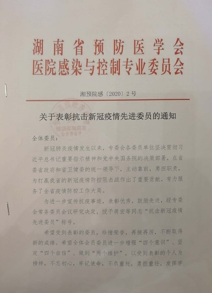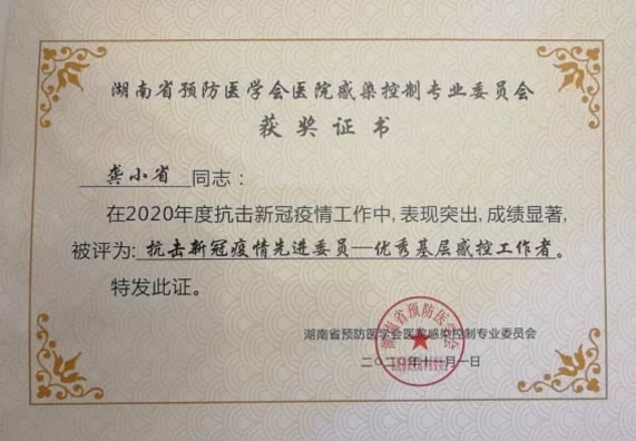喜讯!我院感控科主任龚小省荣获湖南省2020年度“优秀基层感控工作者”荣誉称号