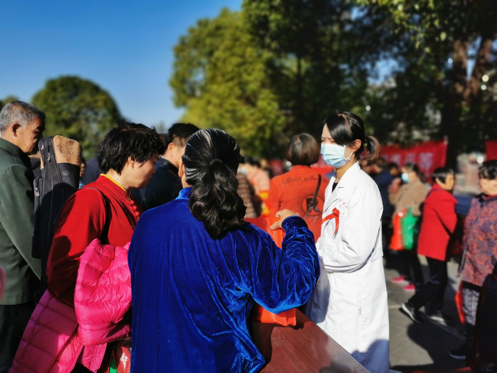 活动中,医护人员设置咨询台,悬挂宣传横幅标语,向过往的群众发放防艾知识宣传折页、宣传小画册,并通过HIV感染率的真实数据及周边艾滋病的一些真实案例,向他们讲解艾滋病的传播途径、预防方法等基本常识。