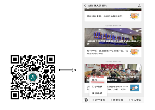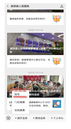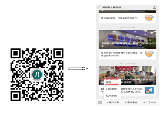 1、关注“新邵县人民医院”微信公众号, 进入新邵县人民医院微信公众号页面,点击“挂号”;