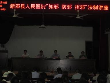 2013年6月6日下午3:00,在医院总支书记唐孝志同志的主持下,我院在门诊四楼大会议室举办了专场“知邪 防邪 拒邪”法制讲座。本次培训的主要对象为医院中层以上干部及部分医务人员。会上,邵阳市委610办副处级纪检组长李奇玲同志就我国邪教的种类和危害以及中央对反邪教的方针政策进行了全面、系统的阐述,接着新邵县县委政法委副书记、县委610办主任李岳成书记就“知邪 防邪 拒邪”进行了补充说明,并要求把此次学习内容认真贯彻到身边的每一个人,同时希望我们广大医务人员通过此次学习能够提高反邪教工作能力。