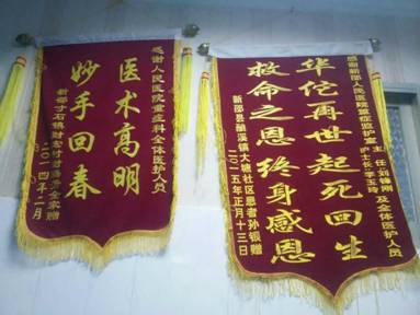 孙某,33岁中青年男性患者,中午11:30许在急诊科医生做入院检查时突发心跳呼吸骤停,立即进行胸外心脏按压。ICU刘主任、值班陈医生紧急赶到气管插管并持续心肺复苏抢救,同时报告医院主管领导商讨抢救方案。凭着大家“不放弃、不抛弃”的坚定信念,经过90分钟的奋力抗战,硬是把患者从鬼门关中拉了回来,也创造了一个医学上比较罕见的奇迹。随后患者转入ICU继续治疗,他们紧急召集全院大会诊,研究最佳治疗方法。当晚19点患者恢复意识,经过ICU医护人员 3天的精心治疗和护理后,患者脱离呼吸机,拔除气管插管,自主进食良好。7天后转至普通病房,18天后康复出院。事后他和家人对医务人员感激涕零,送来了几面写着“医术精湛、生命卫士”、“救命之恩、终身难忘”大字的锦旗……