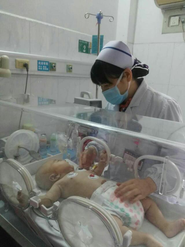 原来,丢丢是一名弃婴。2015年12月2日19时许,新邵县龙溪铺镇中心卫生院的职工发现一名男婴被遗弃在医院门口,当时还输着氧气,口唇明显发绀,初步检查提示弃婴病情危重。该卫生院马上组织人员积极救治。因条件有限,12月3号16时许弃婴被转至县人民医院儿科。儿科主任唐粹立即为小宝宝进行了体格检查。当时孩子T40.2°,P158次/分,R42次/分,精神差全身皮肤稍发绀,可见散在花斑纹,有脐疝,抽血检查示:心、肝、肾等脏器功能明显受损。因患儿系弃婴,主诉、既往病史不详,唐主任立即组织科室讨论研究治疗方案并报告院领导,同时立即给予吸氧、心电监护及抗感染、退热、止咳、化痰等对症支持治疗。李护士长考虑到孩子的特殊性,特意安排科里护士轮流看护,并自费买来牛奶、尿不湿,希望给宝宝提供妈妈般的关怀,并给宝宝取名叫“丢丢”。后来,因科室病人多,晚夜班护士忙,医院专门聘请一名经验丰富的何阿姨照看孩子的起居饮食。