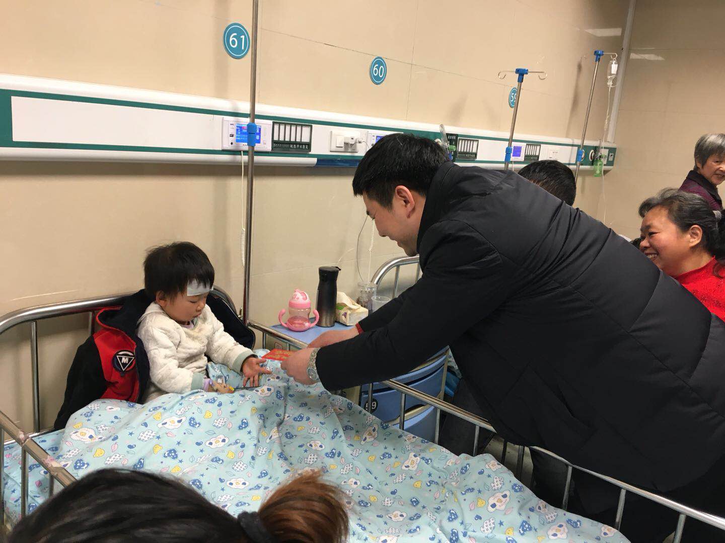 虽然新年里病房较往日显得安静,但是值班的医护人员仍然尽职尽责,毫不懈怠。“新年好!大家辛苦了,我们代表医院向大家拜年啦”,彭院长一行每到一处,都详细询问值班人员工作情况及病人的动态,并与他们亲切握手、交谈,对他们在新春团圆之时仍然坚守岗位,以患者为中心、“舍小家,为大家”的精神表示赞许和感谢。同时,院领导也把新春的祝福与关怀带给了住院病人,每到一个病区,院领导都为他们送上慰问红包,将全体医护人员的温暖送到病人心中,鼓励他们积极治疗、安心养病,祝福他们早日康复、与家人团聚。领导们的亲切关怀,令病人和家属高兴不已、感动万分。在儿科病房,一位孩子家长笑着说:“很意外,也很感谢,这是喜庆的红包,要好好保存起来,为新年讨个好彩头。”