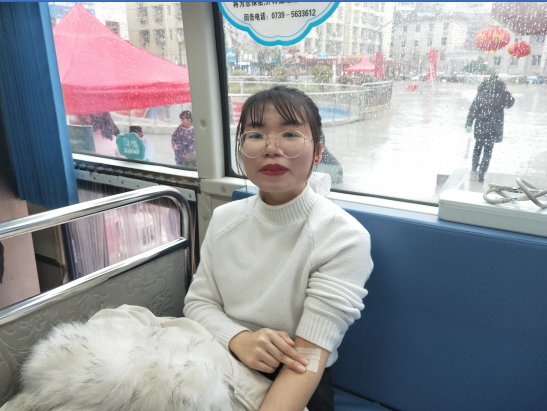 来自检验科的钱新艳是第一次参加义务献血。以前,因为体重不达标,她好几次走上献血车都被“拒绝”了。“抽血的针有点粗,第一眼看到时有那么一丝紧张。但当看到红彤彤的献血证时,想到自己的一份爱心可以帮助到有需要的人,心里就觉得十分开心和自豪!”她腼腆又略带微笑地说到。