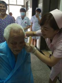 李护士为周老剪头发故事二:一天在车上偶遇一位患者家属,她拉着我的手连连致谢,她说那次她老母亲住院时,由于病房没有床位而住在大厅,因晚上家里有事没能来及时照顾,行动不便的老母亲要上厕所,是我及时扶她母亲去厕所,帮助她拿凳子,递送纸巾等等。我甚至都想不起来患者的姓名和模样,只依稀记得那位老人住哪一床,本来这是很平凡的事,但就是这样一件平凡事却让患者心存感激,记忆至今,我平静的心再一次被感动了。工作的磨炼使我成长、成熟。把病人当做自己的亲人一样对待一直是我们科室的宗旨。