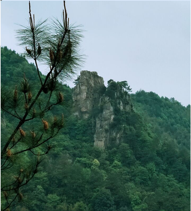 登山过半,我们信心倍增,满身的疲惫在这苍翠的竹海里渐渐消散,在此休憩片刻,倦意全无,我们仰望仙人石,彩云置于石上,天章云锦,甚是好看。沿着竹林前行,来到景区的最佳观赏点,你就会清晰的看到董永和七仙女两位感动上天的爱情,他们相拥而立,永不分离。下面苍松郁郁,山风过后发出涛声阵阵,左首边的山峰独立昂首,与仙石形成对立之势,好像在诉说他们的故事。