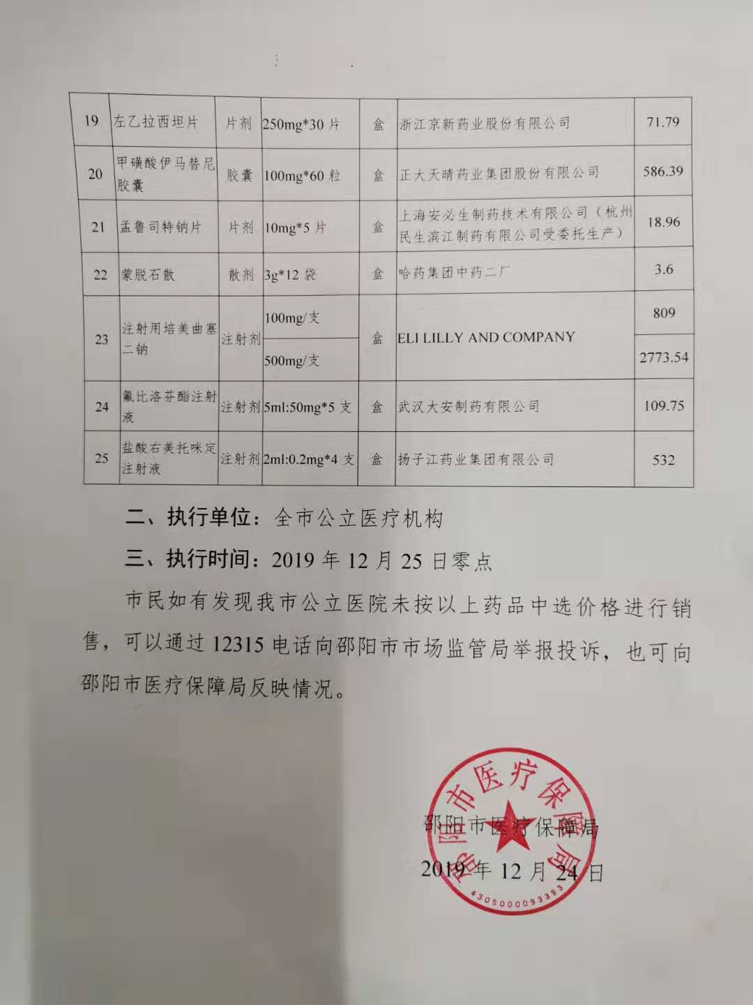 邵阳市医疗保障局关于降低阿托伐他汀钙片等25种药品价格的公告