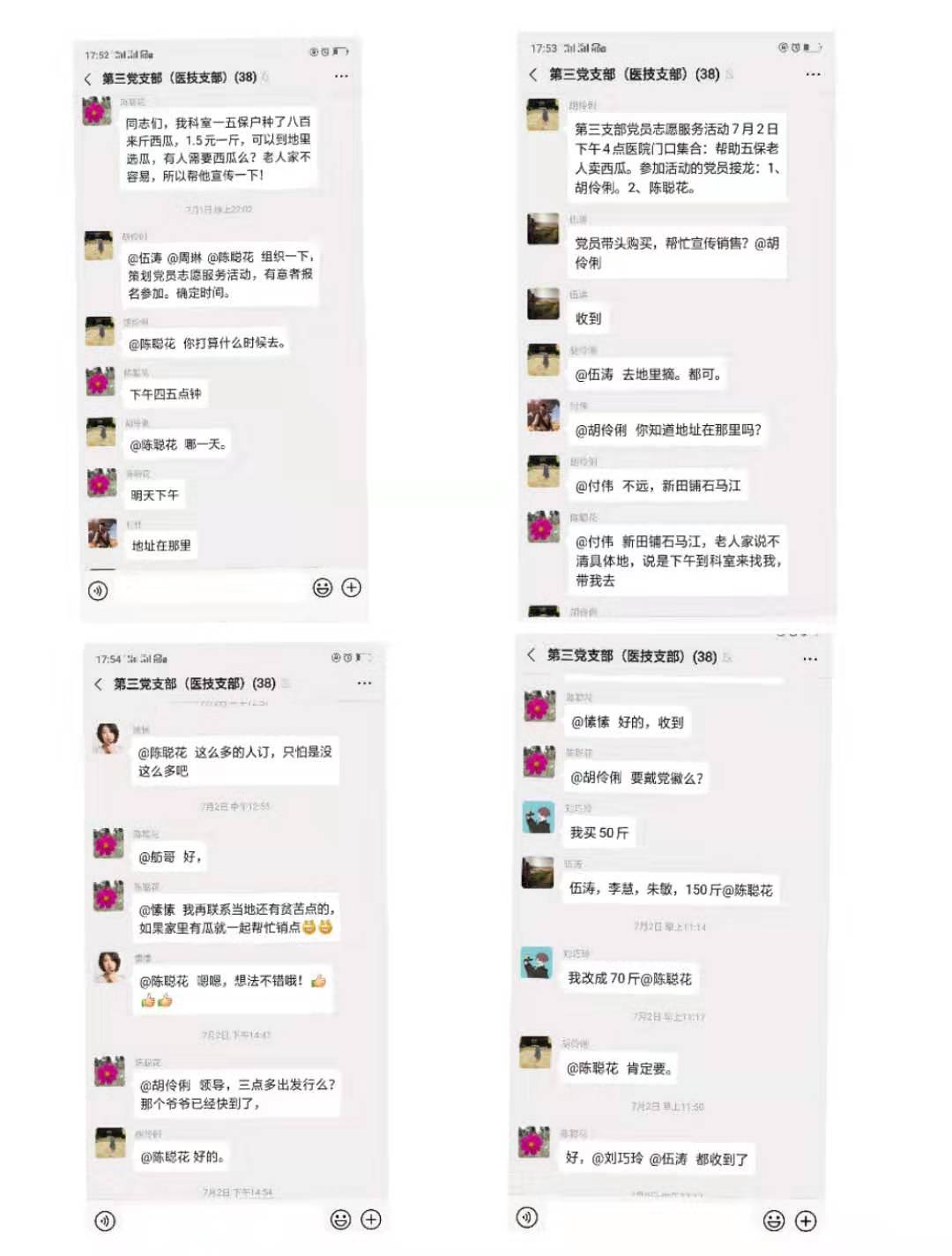 原来,邓大叔和弟弟都是村里的五保户,平日里靠自己种点西瓜、蔬菜维持生计,生活很是艰难。今年年初,邓大叔的弟弟因患“结石性胆囊炎”在该县人民医院普外二科住院治疗。普外二科的护士长陈聪花是一名党员。当她了解到邓大叔一家的情况后,带领科室成员给予了他们无私的关怀和帮助,并在其出院后一直密切关注邓大叔一家的情况。7月1号,陈护士长在得知邓大叔家自己种的八百余斤西瓜滞留无法卖出时,立即在自己所在的第三党支部群里发出号召。所有党员纷纷响应号召,加入到这场爱心接力中来。刘素君认购200斤、刘巧玲认购50斤、伍涛认购150斤……不到一上午的时间,所有西瓜均已认购。2号上午,支部组织7名休息的党员帮助邓大叔下地采摘西瓜。大家齐心协力,经过2个多小时的努力,邓大叔地里的所有西瓜都采摘销售完毕。