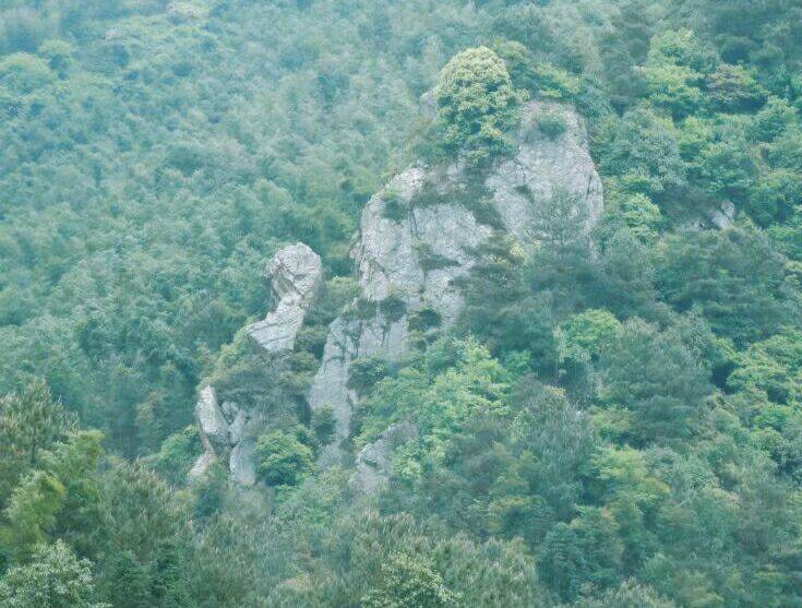 登山过半,我们信心倍增,满身的疲惫在这苍翠的竹海里渐渐消散,在此休憩片刻,倦意全无,我们仰望仙人石,彩云置于石上,天章云锦,甚是好看。沿着竹林前行,来到景区的最佳观赏点,你就会清晰的看到董永和七仙女两位感动上天的爱情,他们相拥而立,永不分离。下面苍松郁郁,山风过后发出涛声阵阵,左首边的山峰独立昂首,与仙石形成对立之势,好像在诉说他们的故事。