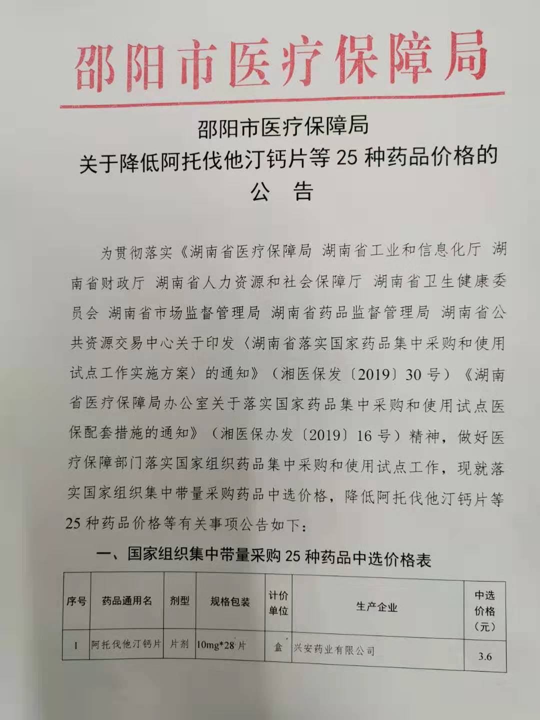 邵阳市医疗保障局关于降低阿托伐他汀钙片等25种药品价格的公告